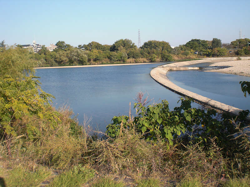渡りきった所に堤防を下りる階段が有るので、先ず車道へ居り、車道を横切ったところに有る階段を少し上がって、広い河川敷(自転車専用道路も有る)を遡る。(14:50)