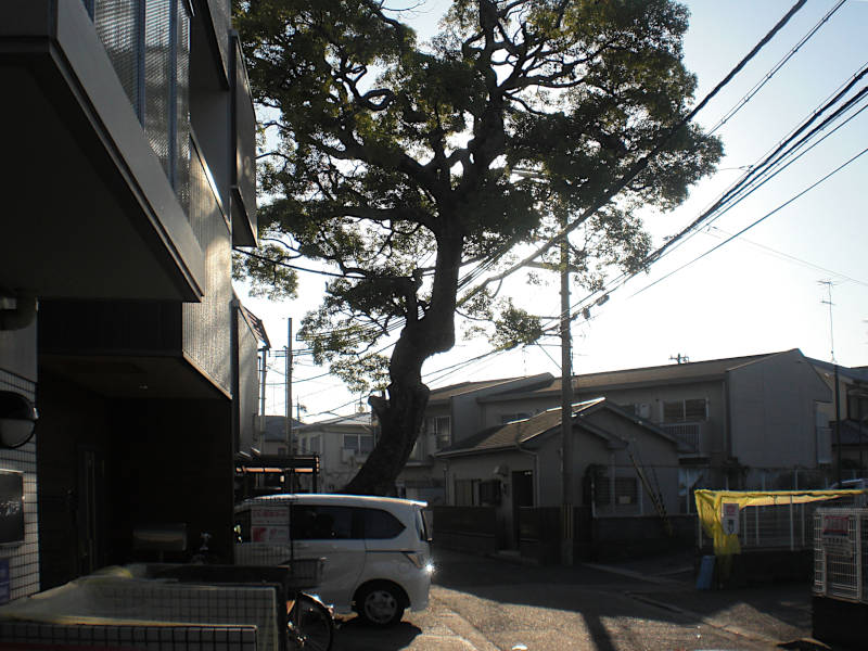 強い日差しが真前から照りつけとてもまぶしい。シルエットになってしまった往時を思わせる大木。(15:33)