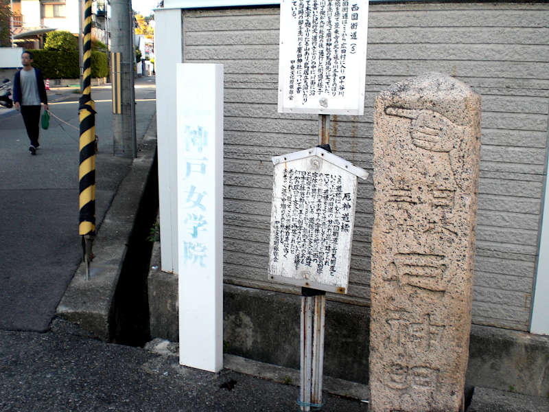 「やくじんさん筋」との三叉路。厄神道標と並んで神戸女学院の案内も有り、門戸厄神の駅に向かう女性群に圧倒されたが理由が分かった。