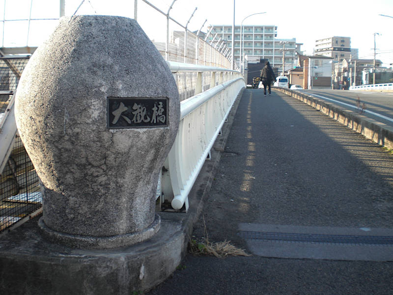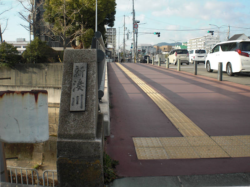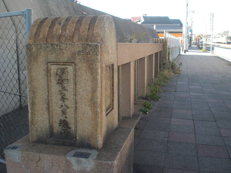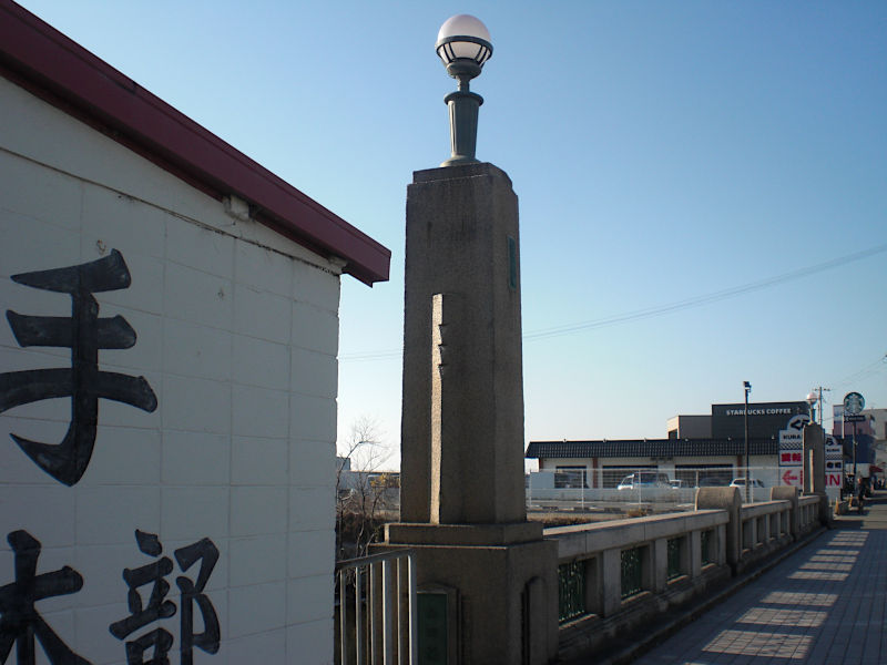 この橋の欄干・親柱は歩道に忽然とただ建っている。川自体は暗渠になっているようだ。地図で見ると海辺に僅かに川の様子が覗える。(13:18)