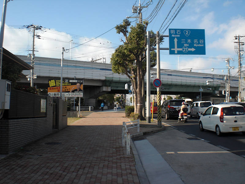 JR舞子駅への歩道橋の所で西国街道に復帰。有意義な寄り道であった。(14:01)