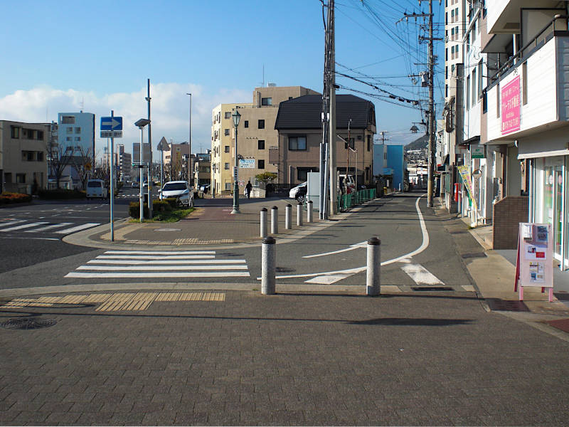 再び枡形となる。すぐ近くの横断歩道を渡るとそのまま西国街道は西へ向かう。(15:23)