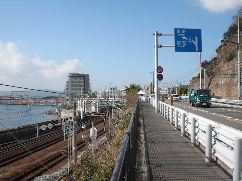 国道2号線の北側側道を進む。JR神戸線が左から近づいて来て合流する辺り、丁度海辺に出たところに「