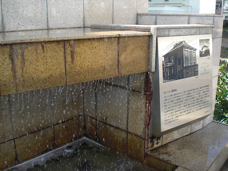 国道2号線が左へカーブし町並みに入ってすぐに、水がしたたり落ちる石組みの表面に建物についての案内が掲示されている。