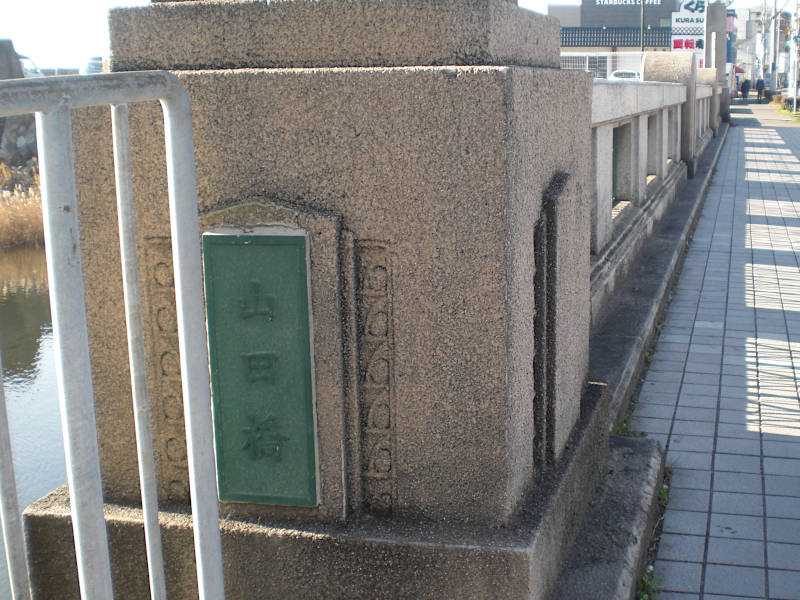 山田橋は立派な石橋で親柱には高い石柱(4m位)が使われ先端には街灯が据えられている。(14:19)