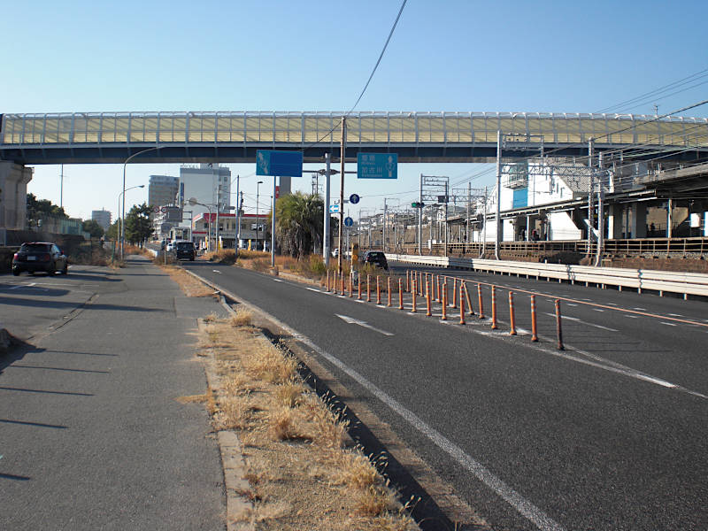 途中一ヶ所横断歩道が有るので2号線の浜川へ移っておく。左はJR神戸線、今通っている歩道と国道2号線。更に山沿いには山陽電鉄と交通の要衝である。