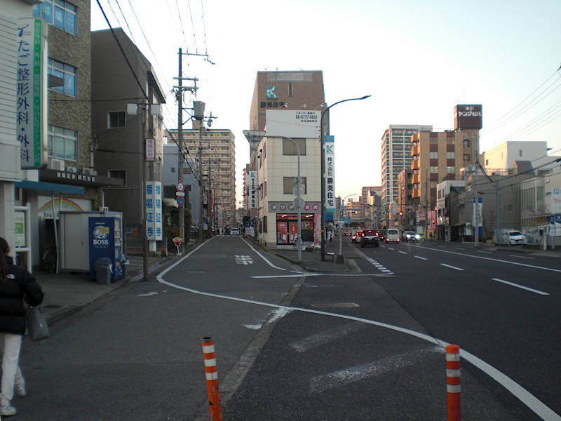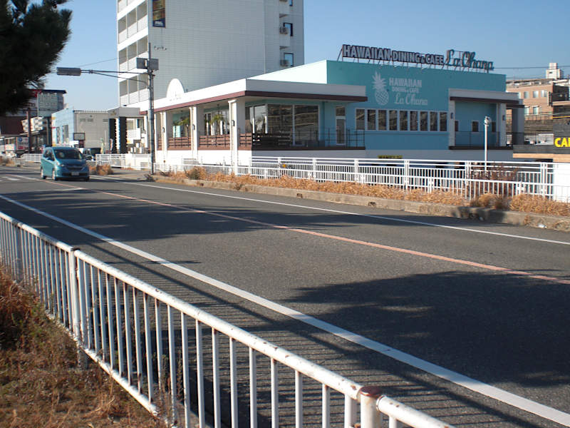 県道21号と同22号が分岐するところが大きな高架となっているが、21号線方向へ陸橋の下を直進する。(8:59)