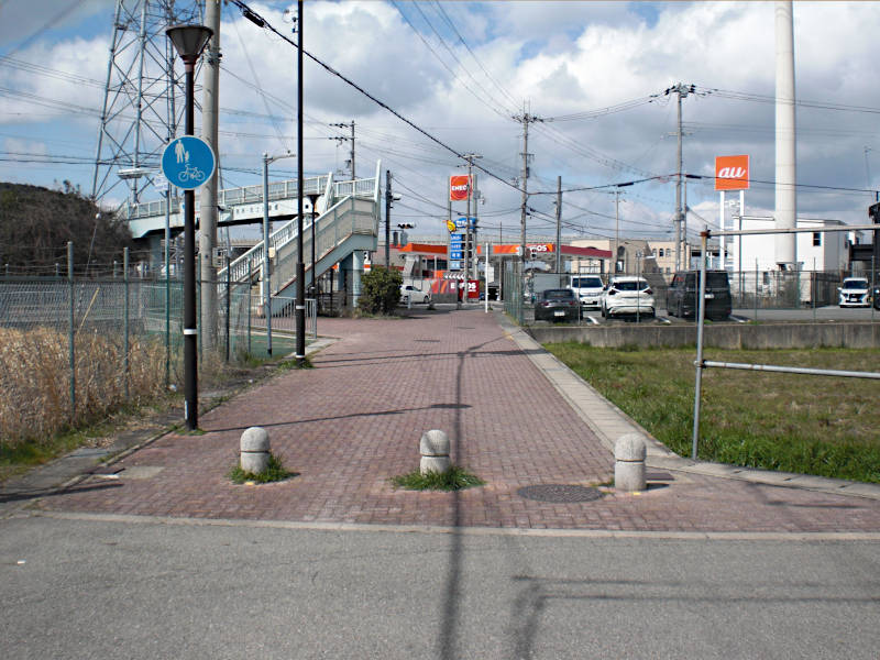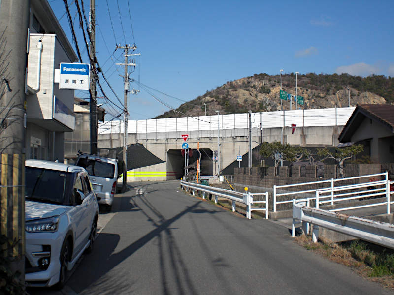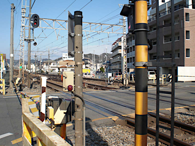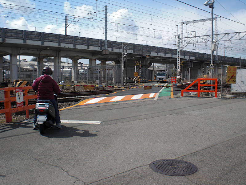 JR神戸線の踏切を渡り、山陽新幹線をくぐってさらに引き込み線の踏切を渡る。斜めの踏切なので結構長い。