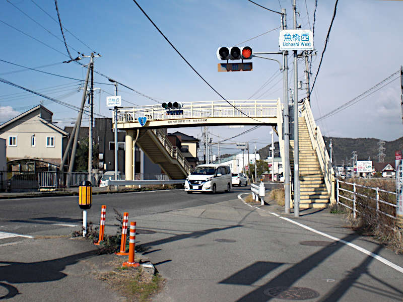 [魚橋西]交差点で国道2号線と斜めに交差する。