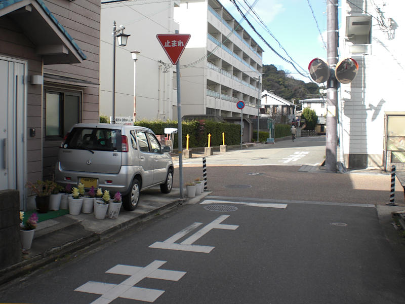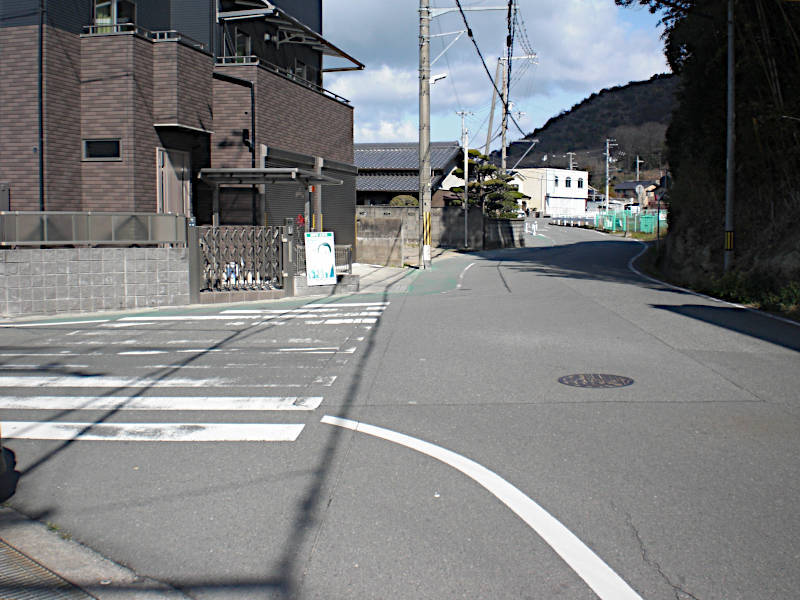 十字路に左から斜めに車道が交差しているような五叉路に来るが、西国街道はあくまで直進。(15:23)
