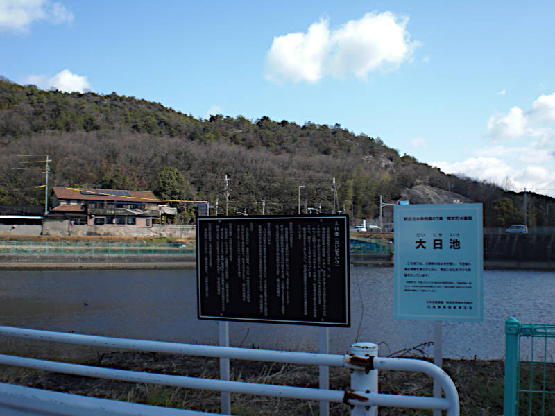 大日池の傍を通る。周辺には古墳が多く有り早くから栄えていたと有る。かつてはこの3倍もの広さがあったが県道や中学校建設用途なり現在は7449㎡らしい。