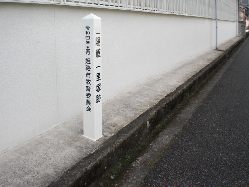 最近建てられたような綺麗な一里塚跡の碑。通常は「○○一里塚跡」のように場所名が入っているが、ここは山陽道一里塚となっている。(12:57)