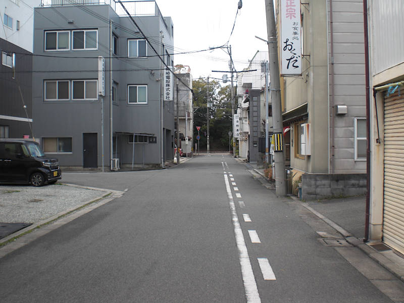 そのまま広い交差点を直進して、一筋先の丁字路を右折する。(14:59) ここまで姫路城の周りを迂回して来て、大手筋以外は本当に城の姿が見えない。