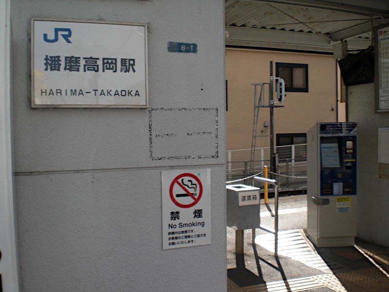 左へ折れると目の前はすぐJR姫新線「播磨高岡駅」である。無人だが愛着感満杯の駅である。