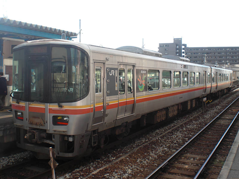向こうのホームに停車した姫新線車両のデザイン。16:02分発姫路行きに乗った。三列シートで立ち席が広く感じた。