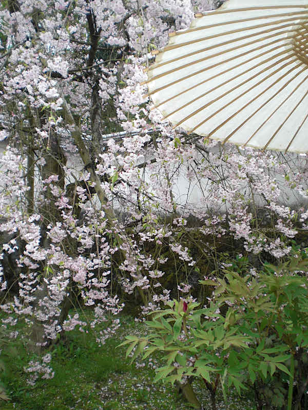 太師堂から階段を下りる所に有る「しだれ桜」。白い唐傘が幾つか段違いに飾られて(何か目的が有りそうだけど)とても風情がある。