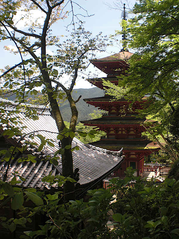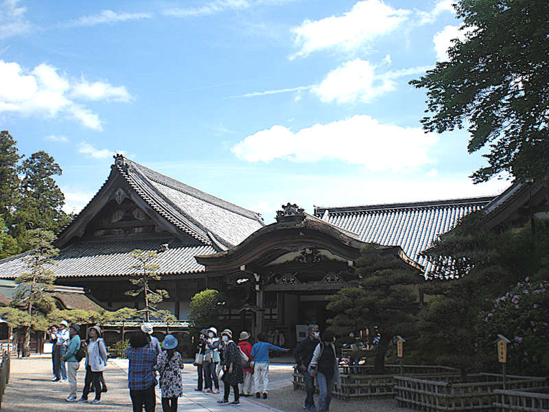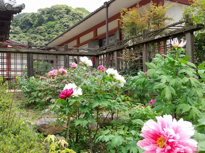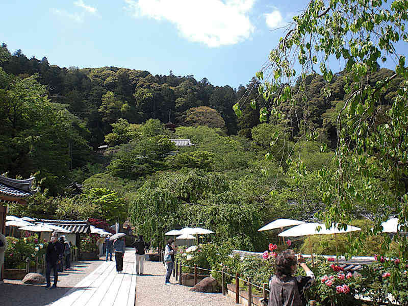 真向かいに五重の塔の先端が見える。これだけ下ってきた。左右を牡丹に囲われた石畳を歩いてくると、門をくぐって本坊前である。