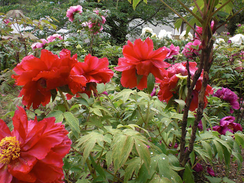 駐車場から少し坂を上がると、もう途中から真っ赤な牡丹、真っ白な牡丹、淡い牡丹が出迎えてくれる。