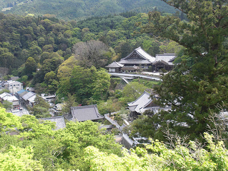 谷になっている門前町から舞台の高さ、これから山沿いに巡る「