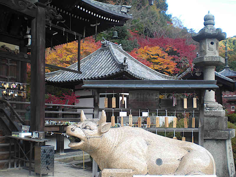 本堂前右手に牛の石像が有り、お賽銭を奉じて口の中にある石玉に触れると御利益が有るらしい。