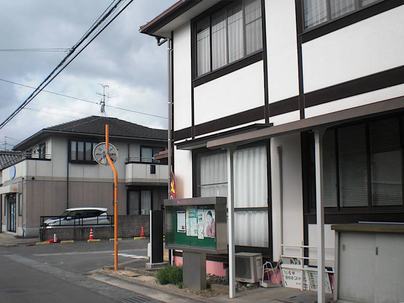西側に出ると少し駅に戻る方向に白い板壁が見える。(地図では衣料品店になっているのだが・・ 08:18)