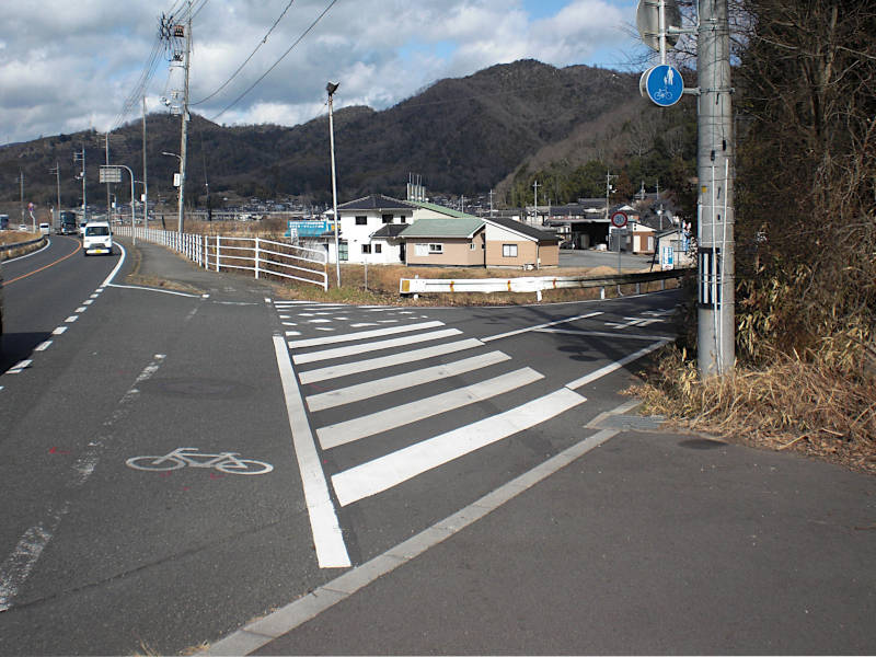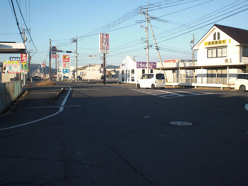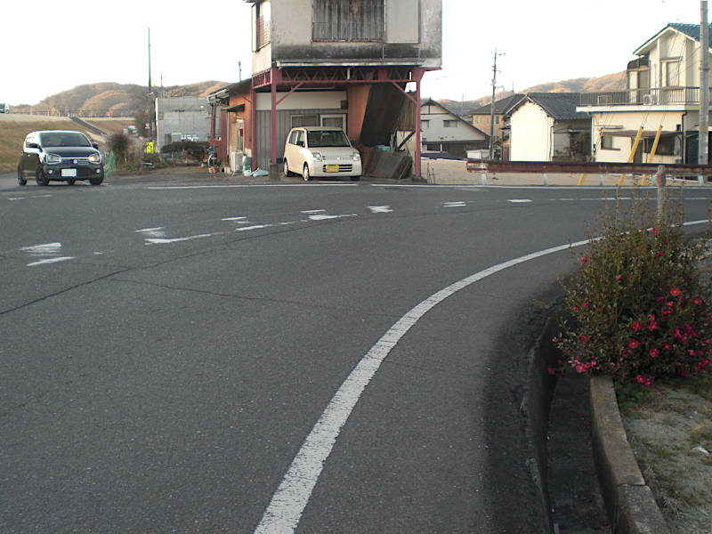 真っ直ぐな国道が緩やかに左カーブし出す辺りに横断歩道が有る。次に右に入るのでそのまま行きたいのだが側道が無くかなり危険。