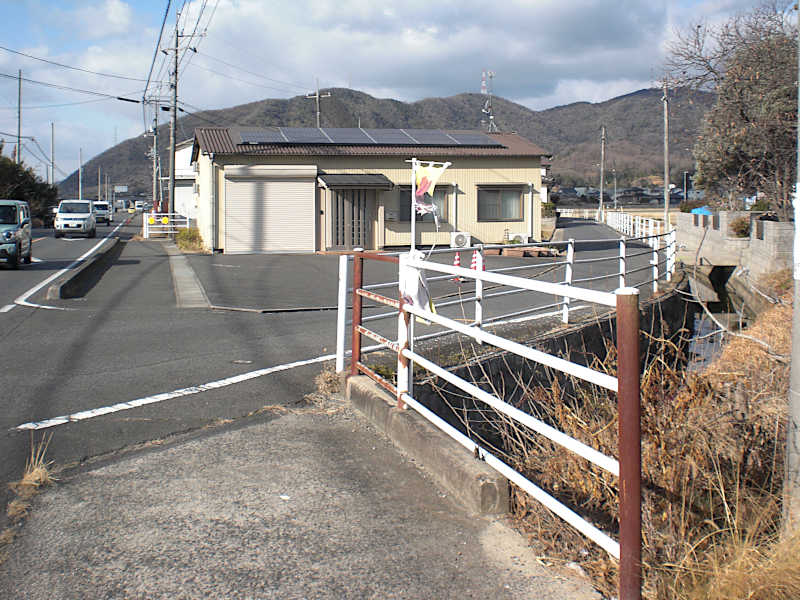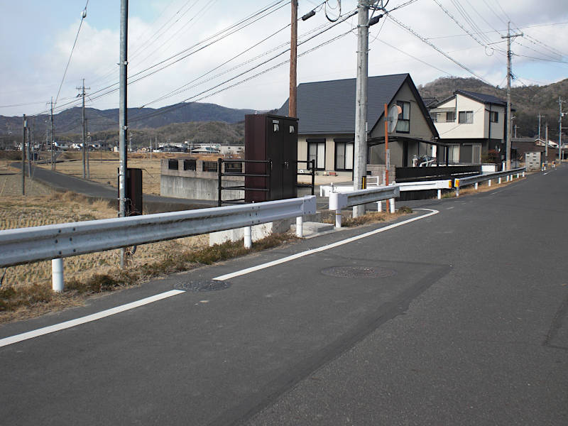 田園風景の中を国道沿いに行くと右側の住宅を挟むように、川沿いに脇道が続いている。これが西国街道である。(09:44)