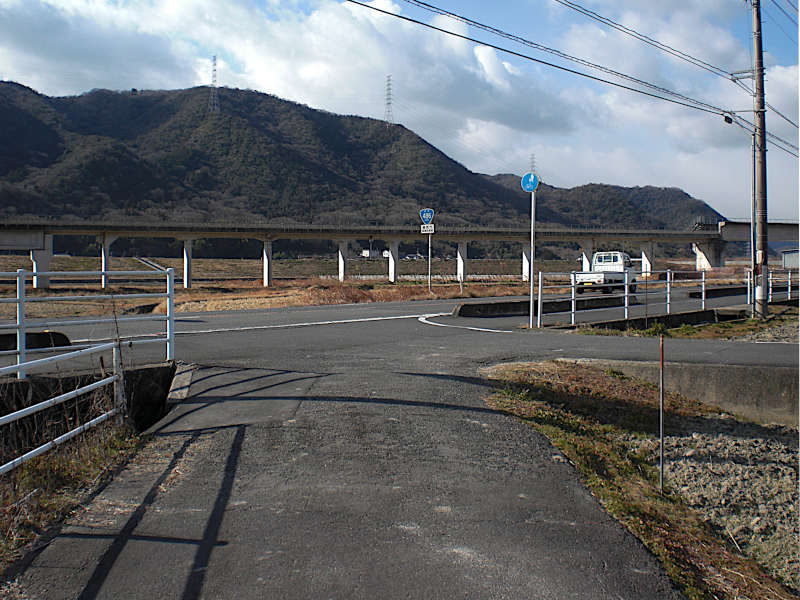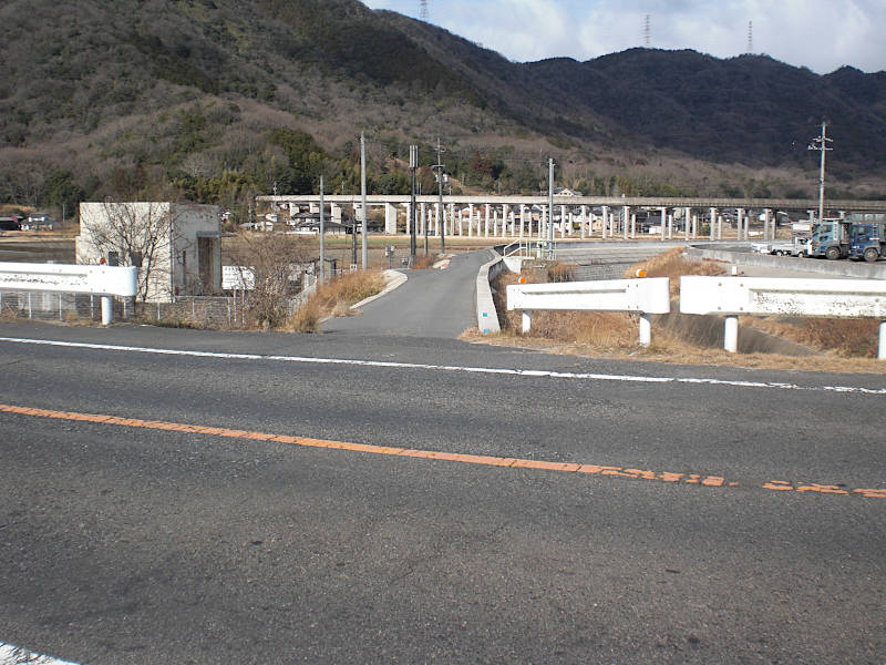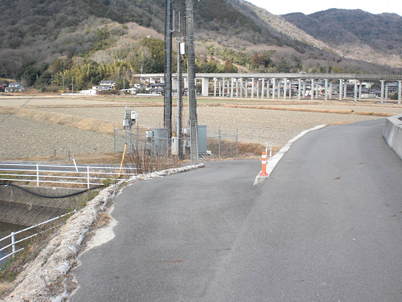 さて渡りきったところで注意すべきは車道の歩道は西国街道ではないと言うこと。写真の堤防を下りる細道が旧街道である。(13:29)