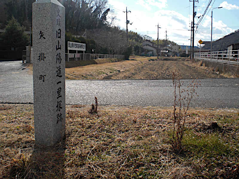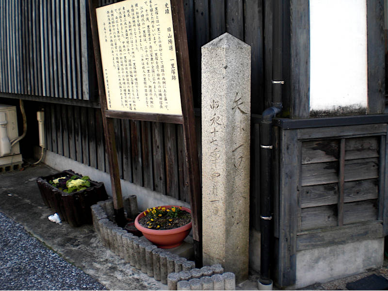 西国街道矢掛の一里塚跡」が左側に、民家の板壁に沿うように建っている。(12:18)