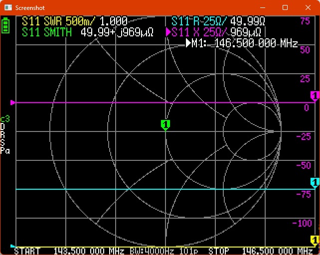 ] にて 25 [Enter] を指定する。 右図、右端の目盛りが 25 刻みとなり、水色ラインが 50Ω のラインとなる。
