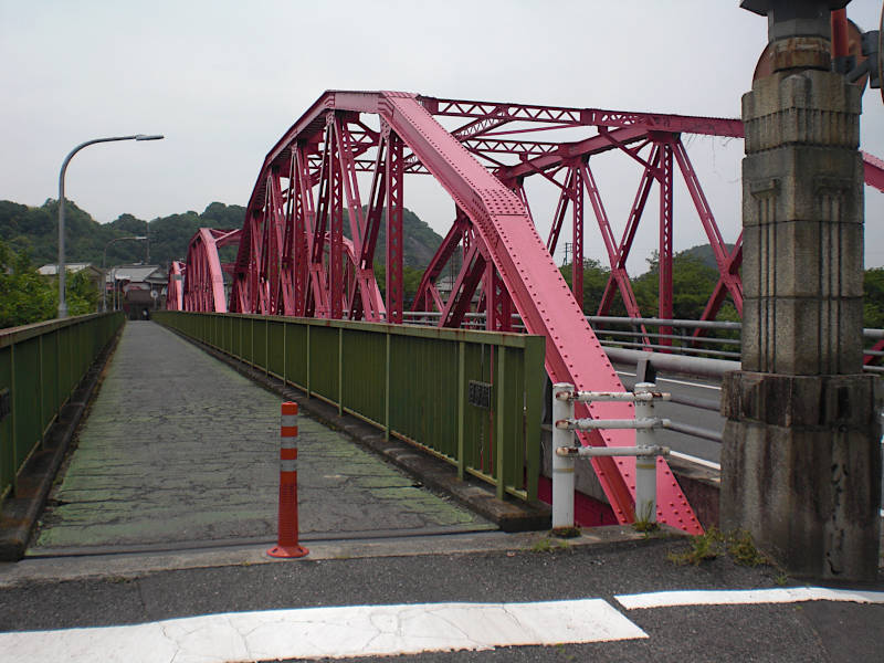 朱色の鉄橋に沿って歩道橋がある。江戸末期(1857年)に木製の橋が架けられ、後に流出したため大正期にトラス橋として、50m上流に架け替えられた。