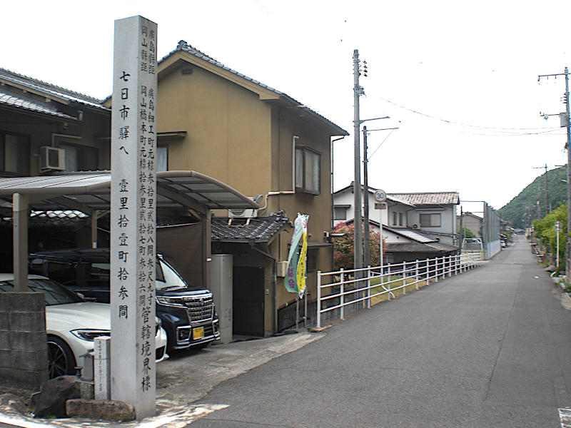 広島・岡山管轄境界線」の石碑には七日市宿へ5km余り、岡山本町元標から54km、広島細工町元標まで118km、管轄境界線と記してある。