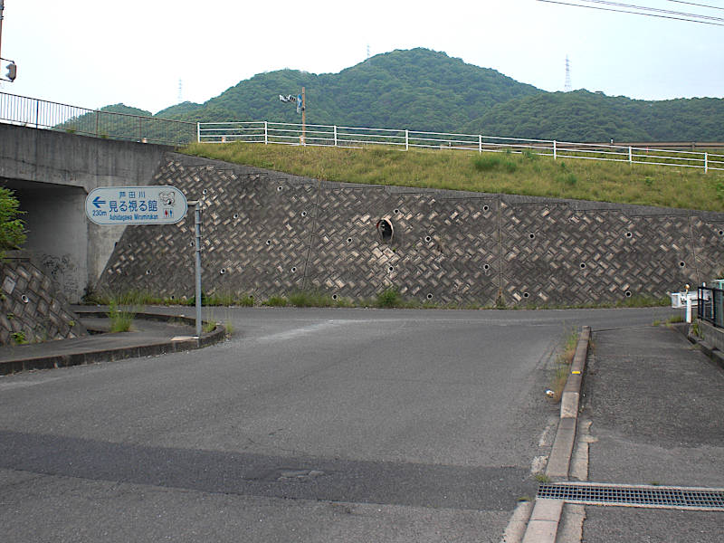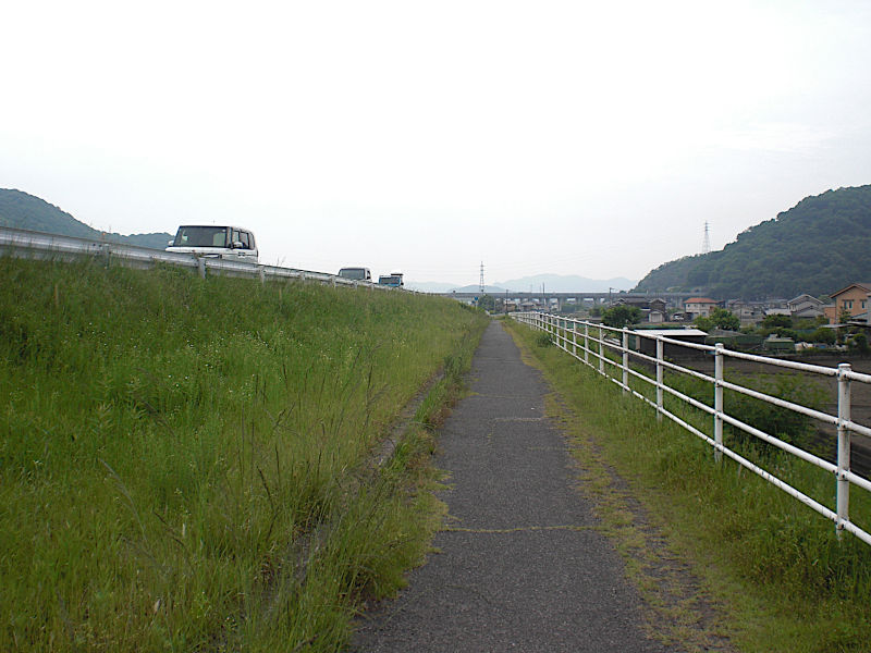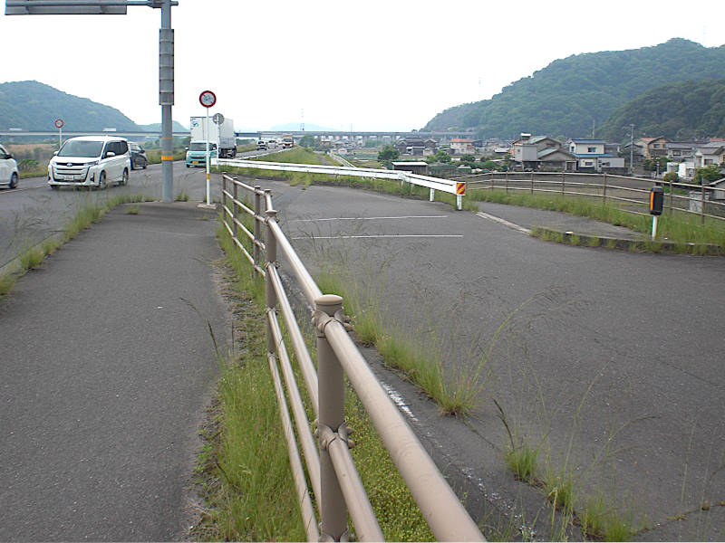お地蔵さまから少し行くと、堤防中腹の歩道は無くなりそのまま車道に合流して右にカーブし、芦田川から離れて行く。(09:23)