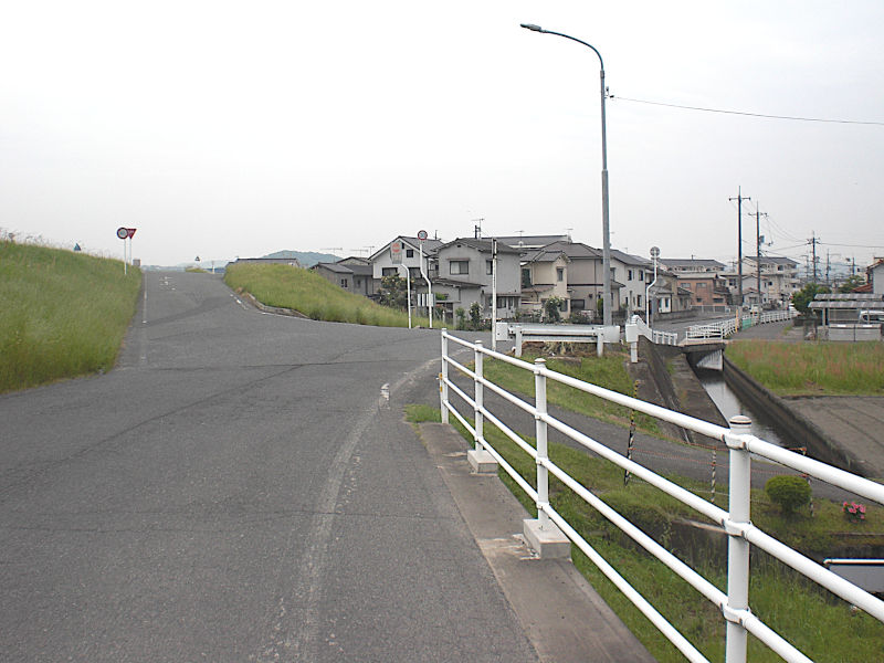 橋を渡り切ると、歩道の無い車道に不安を感じたが、よく見ると横断歩道を渡ったところに一部歩道が有り、側車道を横断すると堤防の中腹へ下る歩道が有った。