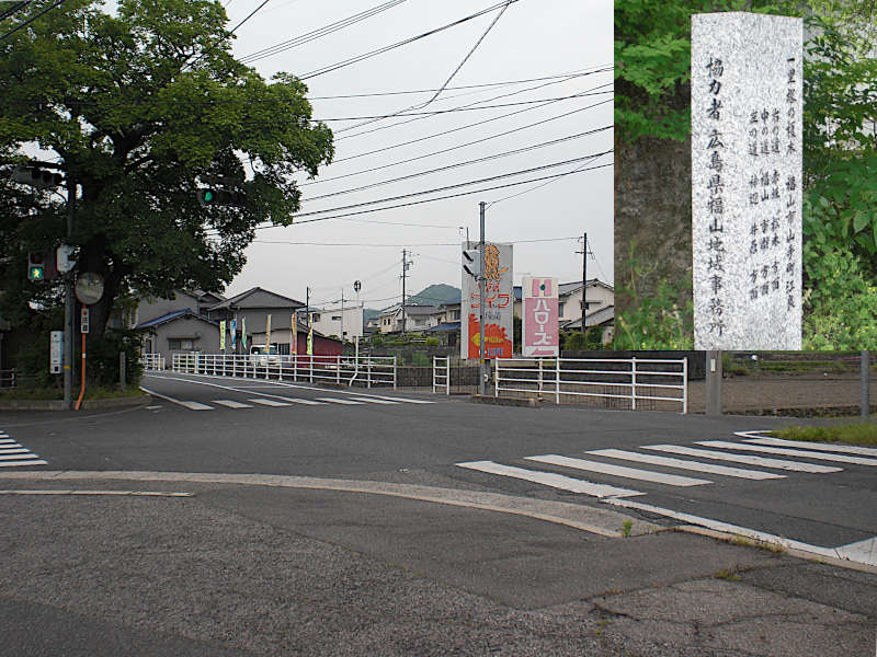 真新しい石碑が建って居り、今風の表現で方位が記されている。また、この交差点右手からは、大渡橋西詰から別ルートを通って「旧中世山陽道」が合流している。