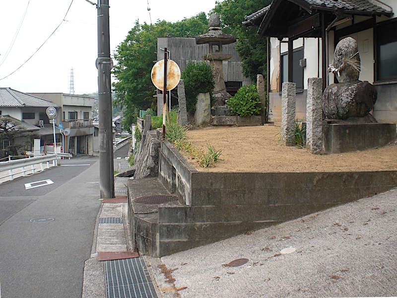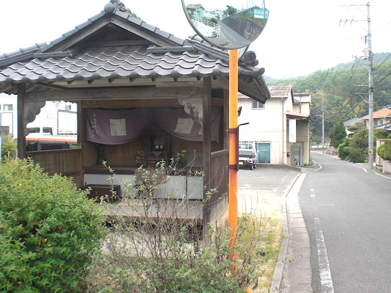 集落を抜け、山沿いの道も下り坂となる辺りに「地神と常夜灯」が祀られている。