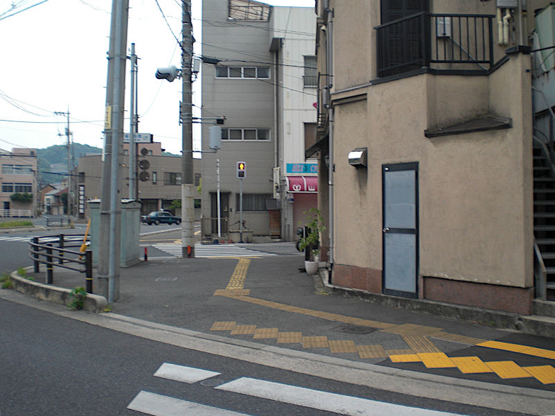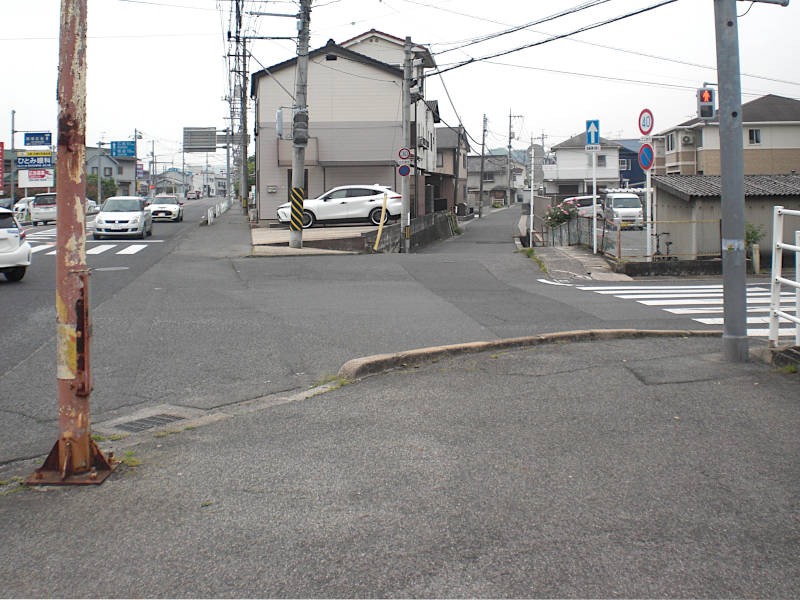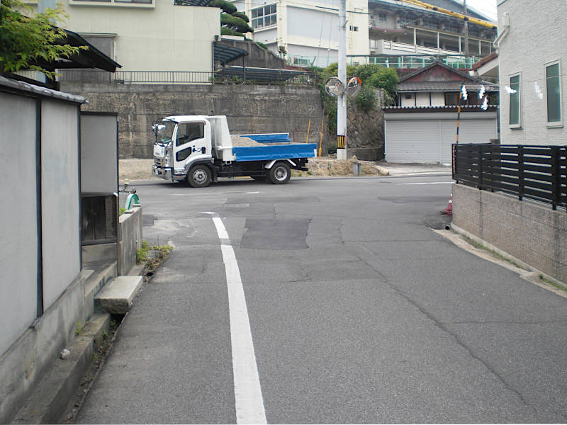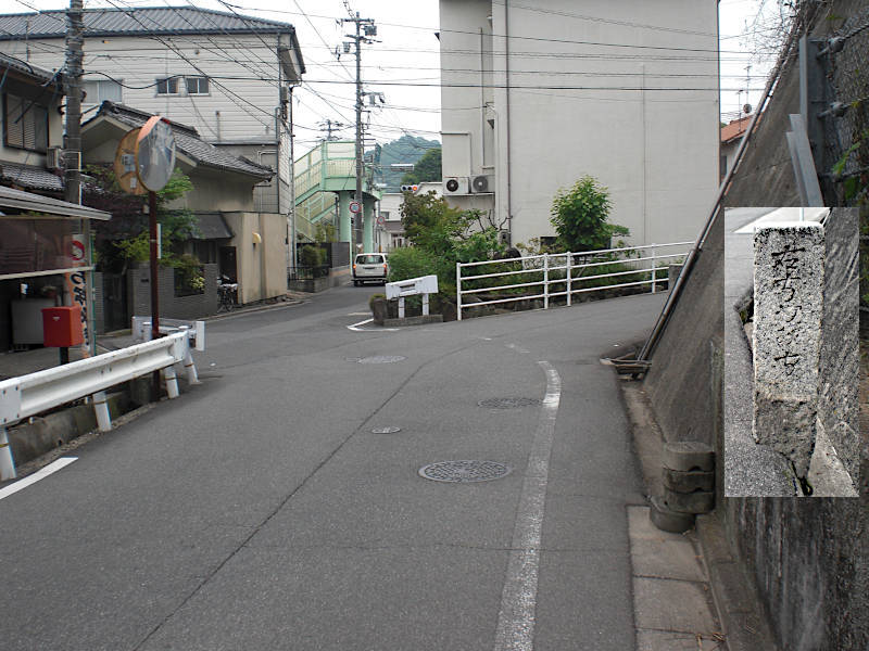 横断歩道からもう見えているが、西国街道は左手へ坂を下りる細い道となる。(14:33)