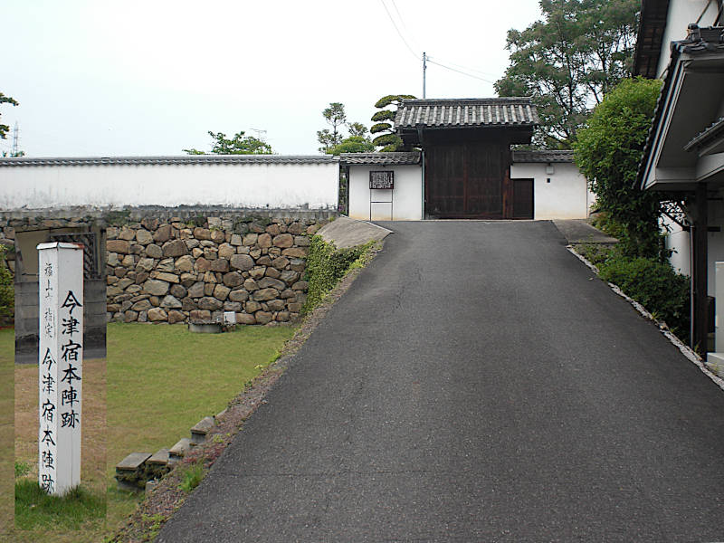 西国街道 今津宿本陣河本家跡」。城郭のような石垣の上に建つ立派な本陣が現存している。
