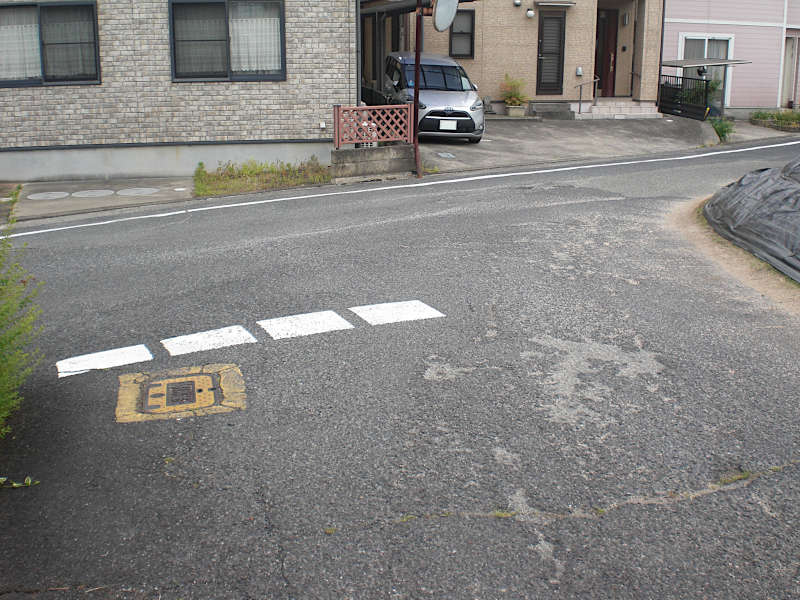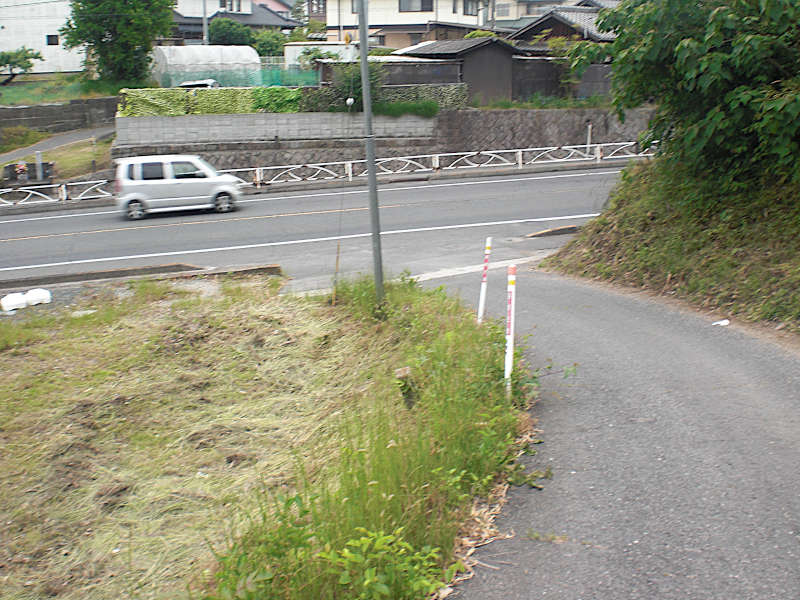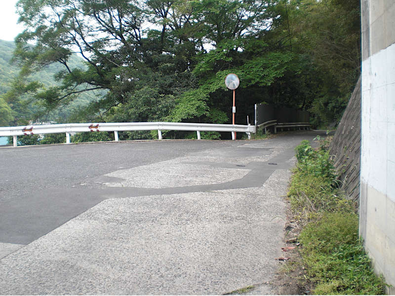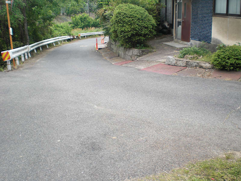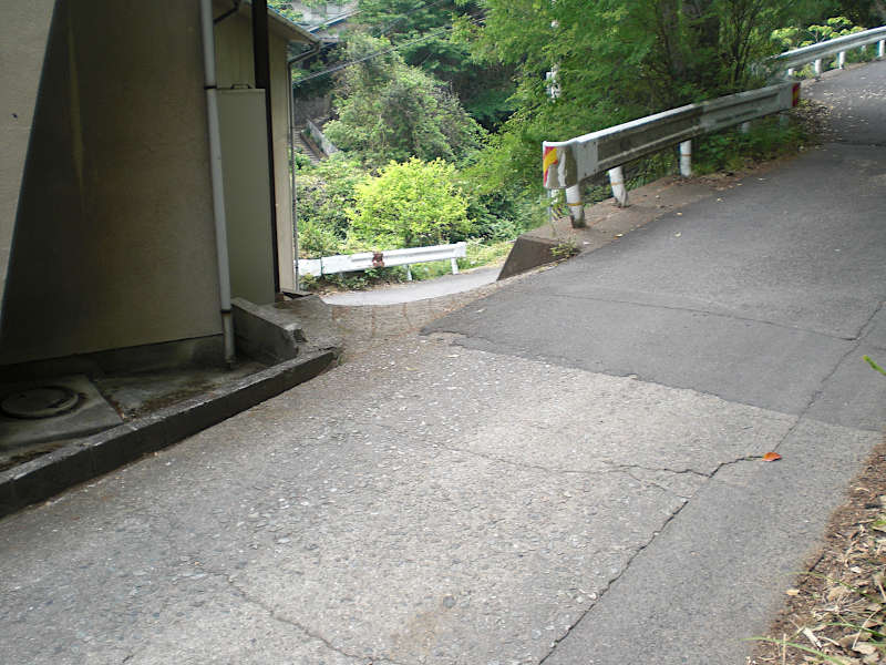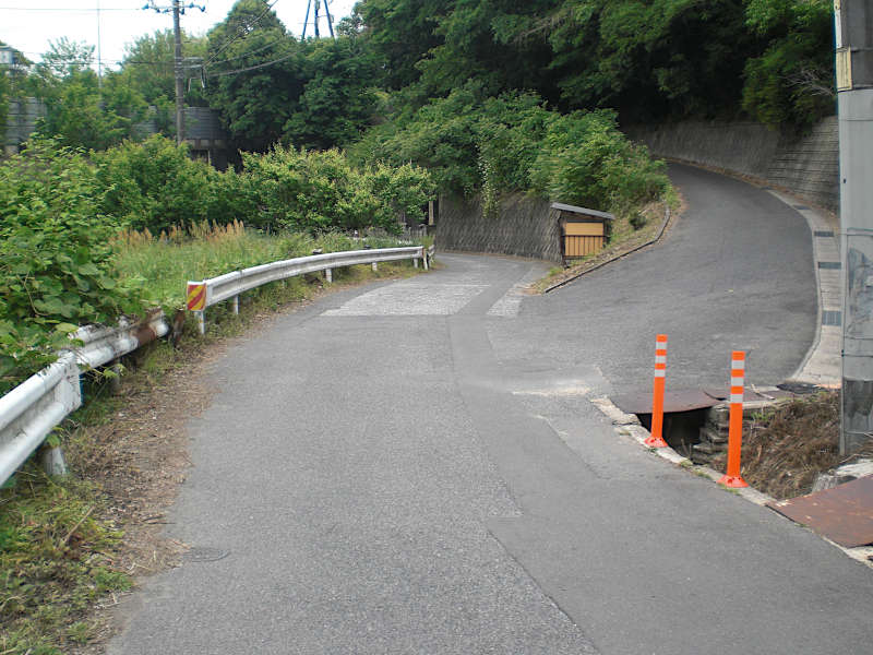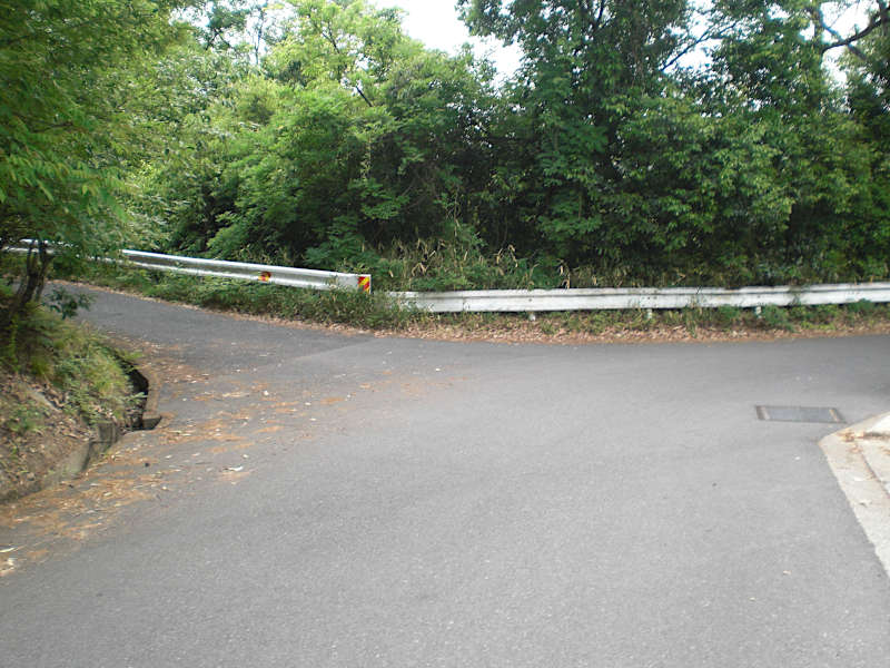 登り切ると三叉路のアスファルト道の角に出るが、メインの車道からは離れるように右折する。(15:08)