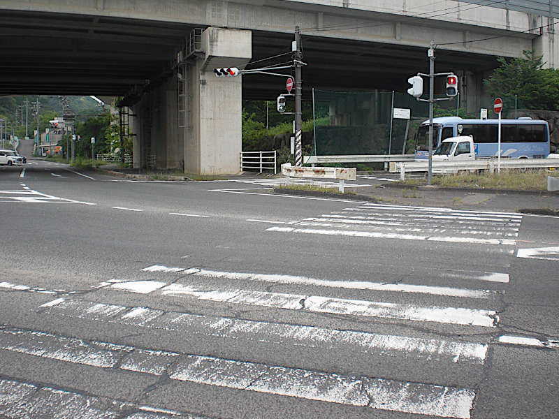 先ず、目の前の高須線を横断して向こう側へ。次にバイパスから下りてくるランプウェイを横断して高架をくぐり抜ける。(出たところ)