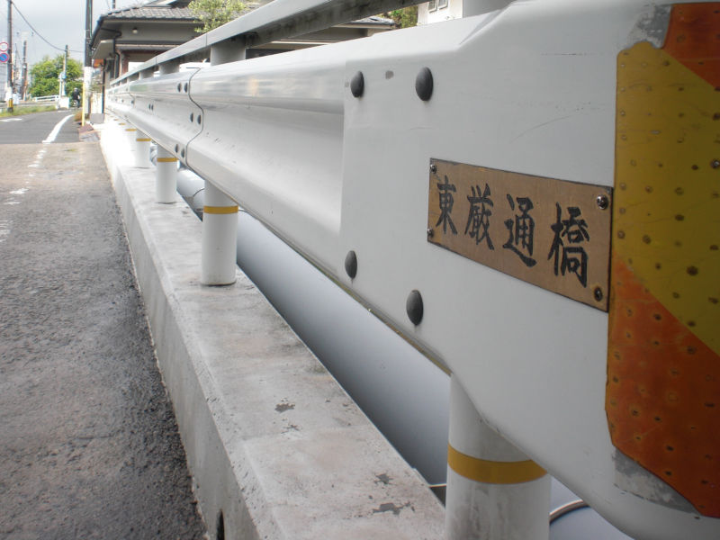 三菱重工業の正門前で広くなってなっているので高架道路の橋脚の方に渡る。