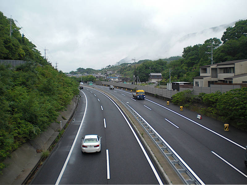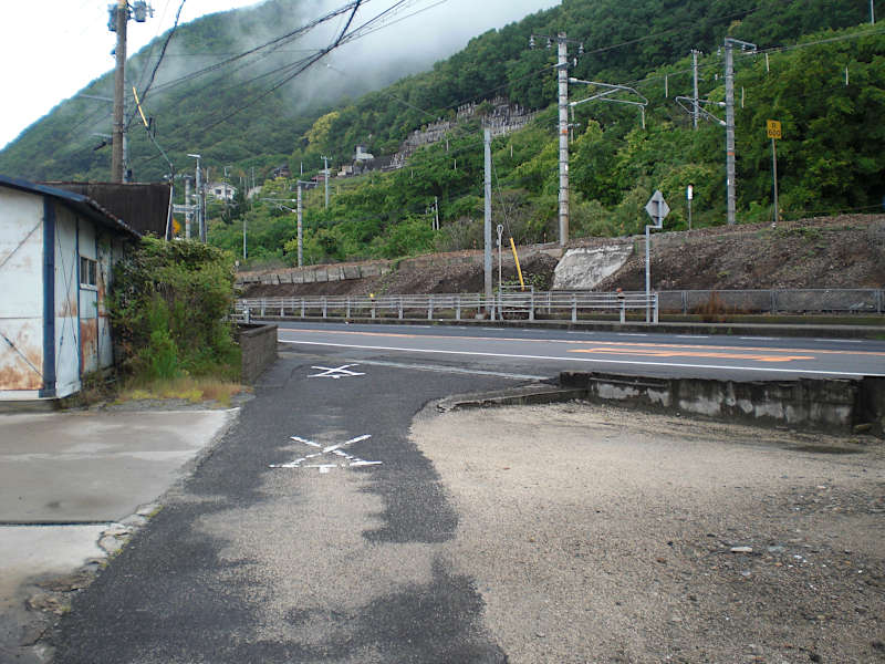 峠越えと同様海辺の霧雨に傘を差す。この辺りは2号線がバイパスに合流し国道185号線(旧国道2号線)となる。