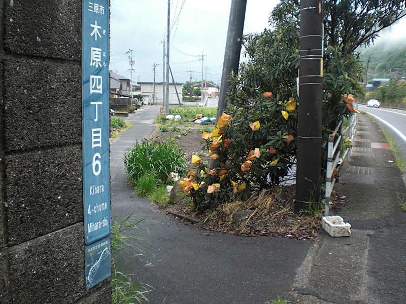 写真のように「三原市 木原四丁目6」の標識が塀についている所から左へ分かれる。入口向こうにはびわの実が沢山なっていた。(10:17)