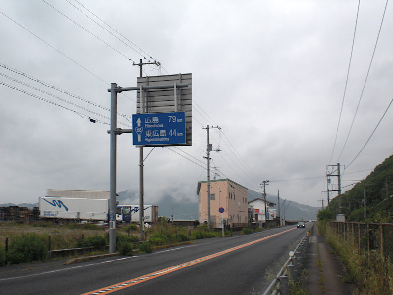 [広島 79km] の道路標識。広島まで行けると3分の2の達成となる。未だ未だだけどモチベーションが上がる。先ず今日を達成すること。