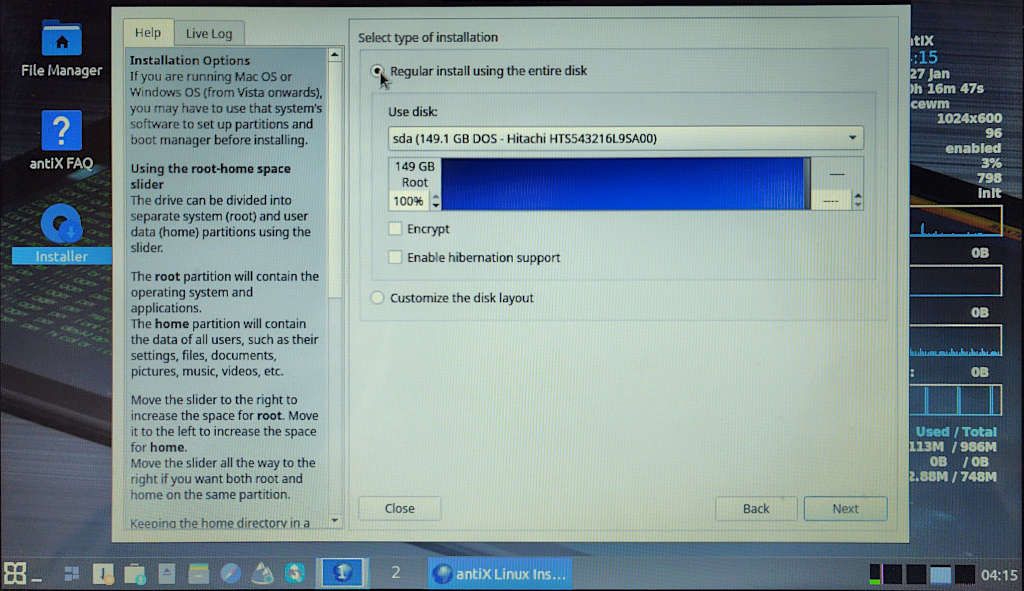 ○ Regular install using the entire disk] を選ぶと完全なる新規インストールとして HDD/SSD の全体を使ってインストールされる。