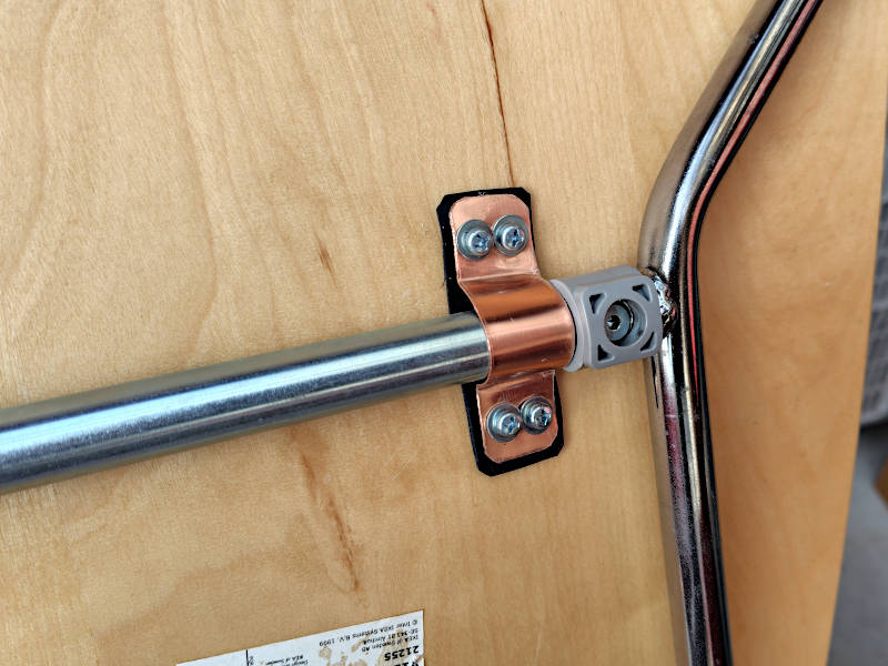 材料は、アマチュア無線のアンテナ用に持っていた銅板。柔らかくて加工しやすい。4mm ボルト1本に対してビス8本なら強度的には強くなると計算したが結構行けそう。