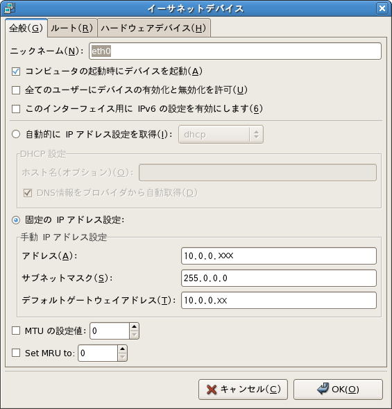 - ネットワークデバイスの設定画面です。標準ではDHCP(自動でIPアドレスを取得するモード)になっています。