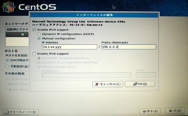 [Prefix(Netmask)]には[255.0.0.0]と入力し、[OK]を押します。(後からでも設定可)