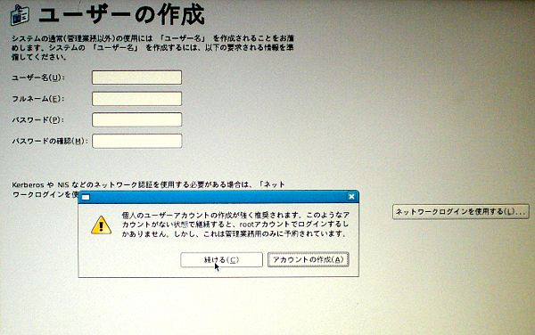- ここでは、ユーザーは作成しません。通常のデスクトップだと[root権限](WindowsでいうAdministrator)で使用するのは危険、
