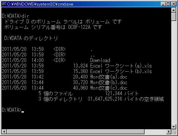 復習すると、プロンプト[D:\DATA>]は、Dドライブの中の[DATA]というフォルダーの中にいることを示す。